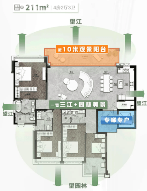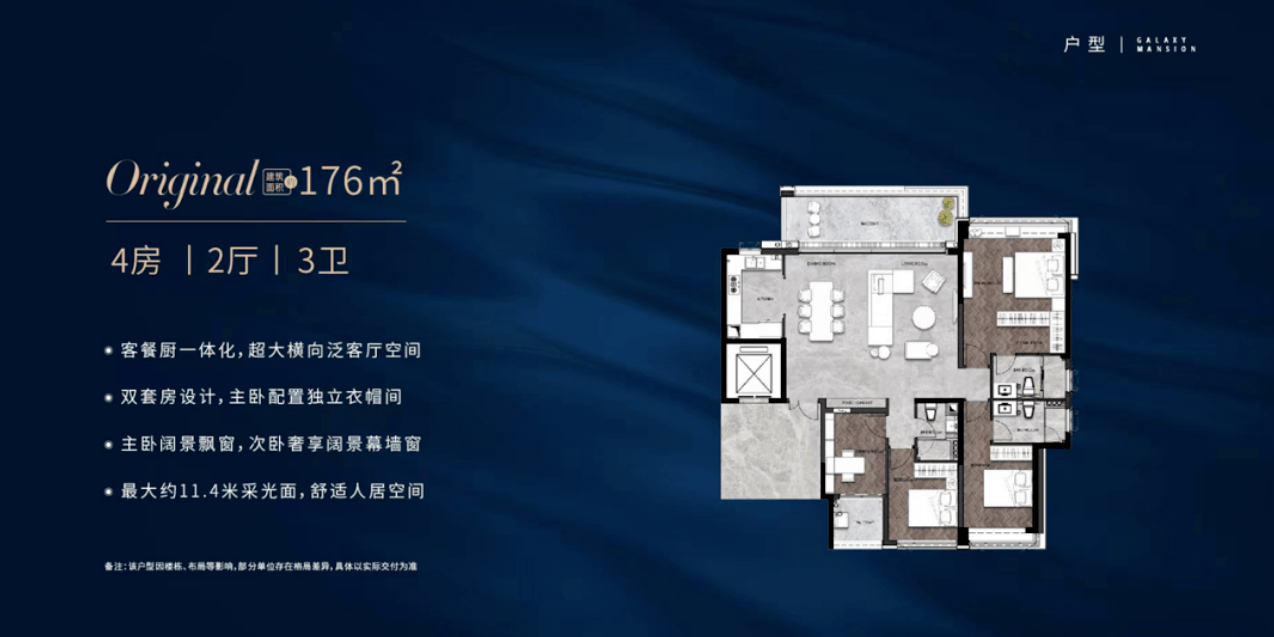 星河江缦正在产物定位上很是清晰,目前正在售的均为四房三卫大平层,涵盖建面176-235㎡多个户型。这一面积段精准地击中了改善型家庭的焦点需求。跟着二胎、家庭数量添加,对栖身空间的要求也越来越高。保守的三房户型曾经难以满脚多代同堂或多孩家庭的需要,而四房三卫的大平层则完满处理了这一痛点。四个房间能够别离做为从卧、儿童房、白叟房和书房,每小我都有的私家空间,互不打搅。三个卫生间的设想,避免了早高峰列队洗漱的尴尬,提拔了糊口的便当性。